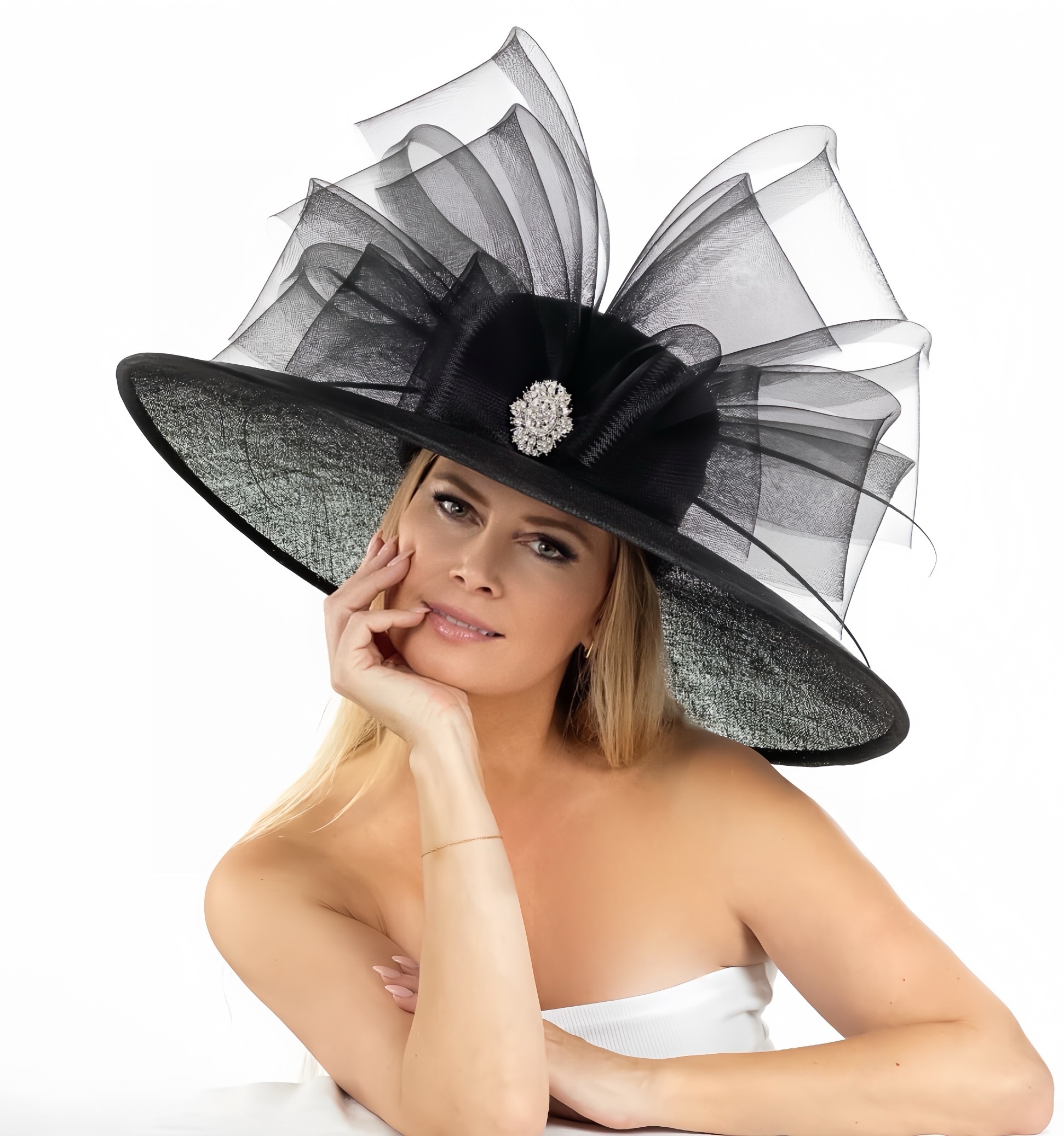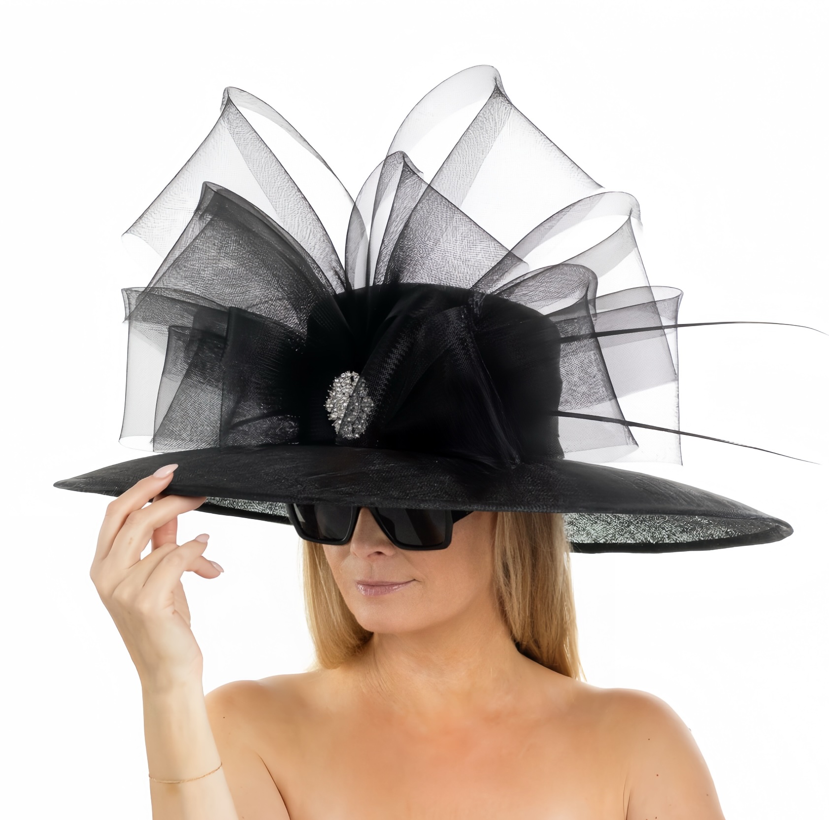 Latest collection absolutely stunning solid black hat with a large airy crinoline bow. Adorned with a rhyne stone brouche for that extreme chic look. You can’t go wrong with this hat! It will go with any color solid dress or a dress with black elements. Made of triple layer of sinamay straw for durably and crin bow for that glamorous chic elegant look. Can be customized in different colors – more than listed here and head sizes. Brouches in the center might vary by shape and color depending on what in stock or your personal request.