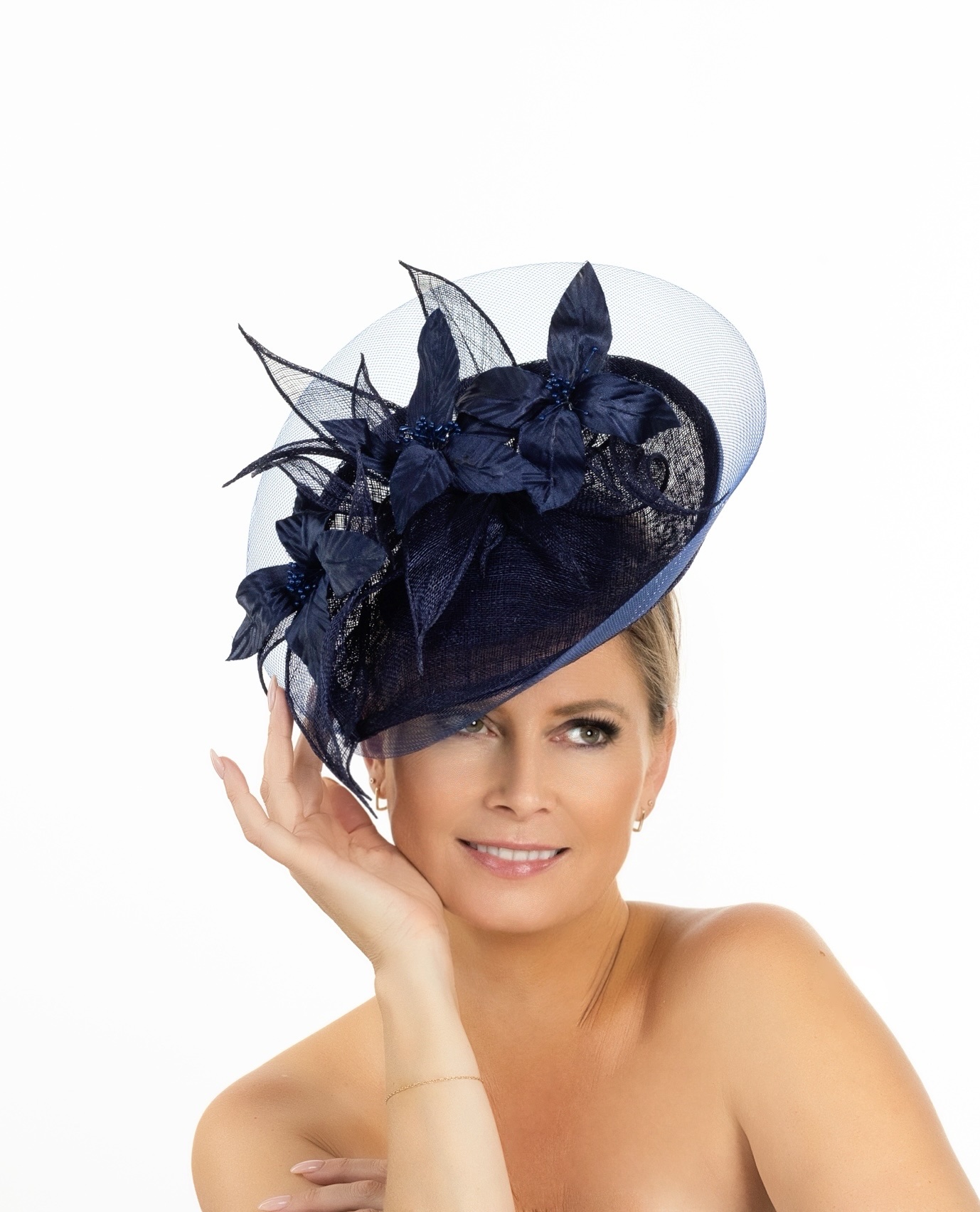 It is a very pretty on a smaller side for petite or not women fascinator. It’s made of triple layer of sinamay and extended with the crinoline for a see through effect and extending the size. Adorned with a set of 3 silk handcrafted silk flowers and feathers-custom made- and sinamay hand curled leaves. It’s light and worn on a headband and secured with a metal comb. There is a wide variety of colors! Since it’s handcrafted, the shape can vary very slightly